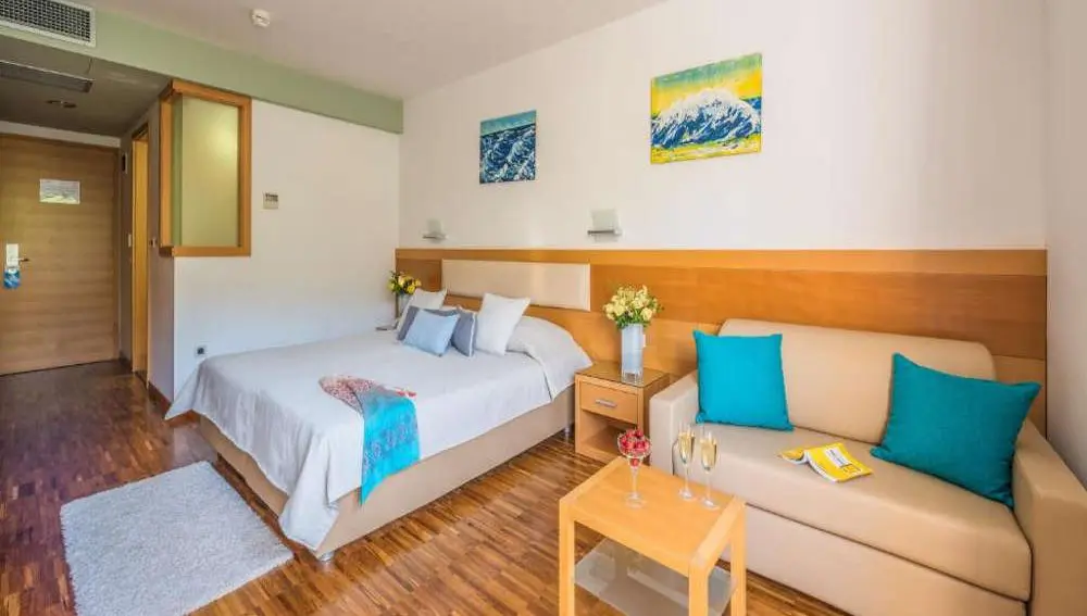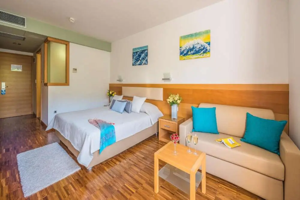 Hotel’s wellness and fitness centre is the largest on the island and features various saunas, Turkish baths, hydro massage hot tubs and a dozen beauty treatment rooms. The hotel has both an outdoor and indoor pool as well as a kids’ paddling pool.